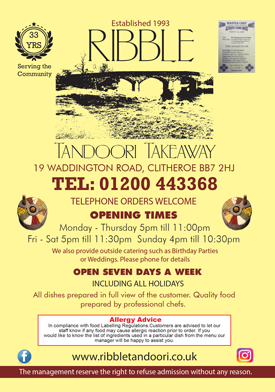 We regularly visit Clitheroe just so we can call for a takeaway from Ribble Tandoori. I just wish we lived closer. Fantastic little business. Well done!